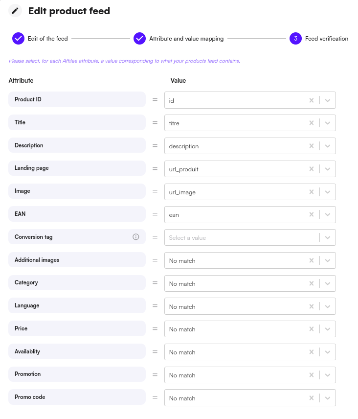 - Special case: In the case of a feed intended for the “Top Products” functionality, you will enter the conversion tag attribute. This attribute is used to link the values of product IDs when a conversion occurs and find the corresponding match in your product feed. This way, you can view your top 10 selling products through your dashboard. The value can correspond to the product ID or the EAN, for example. This attribute is mandatory; otherwise, the feed will not work.