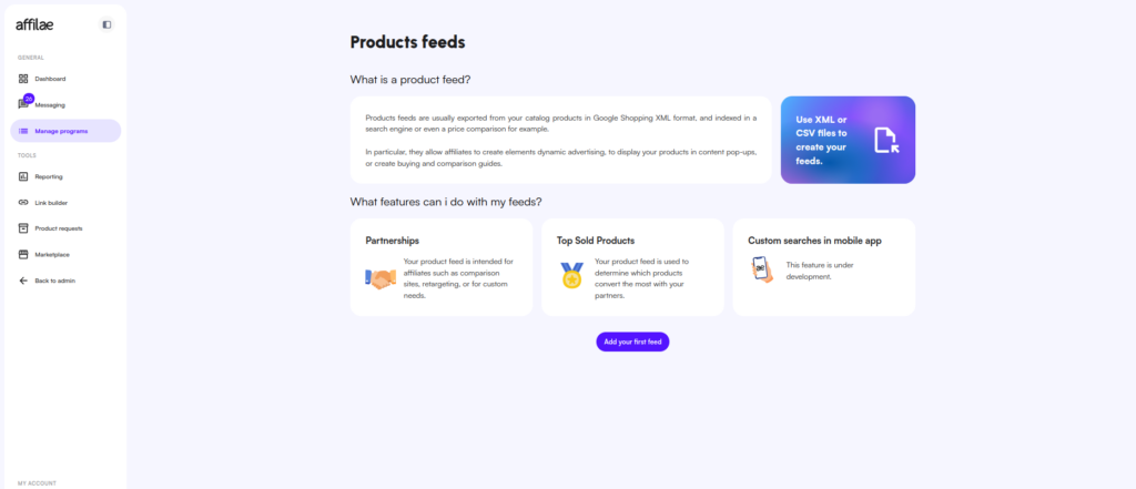 To add your product feed, please go to the left menu “manage programs“, then navigate to the “media” section and select “Product Feeds“.