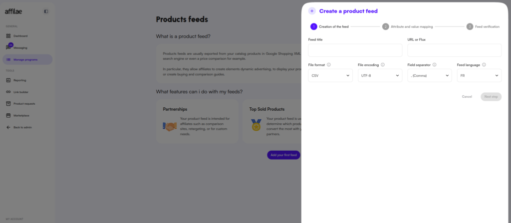 Below are the various steps required to add a product feed to your affiliate program.