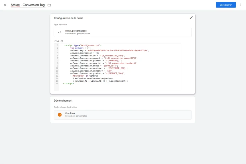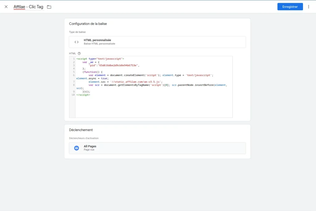 - Code: copy and paste your Affilae script, available in your programme under the Tracking tab ➜ Custom Integration ➜ Track Clicks.